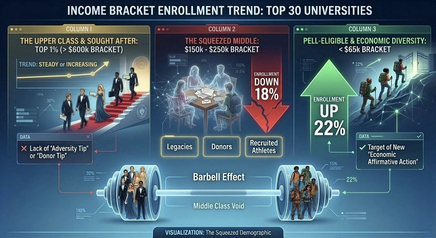 Historically, race-based affirmative action was the primary tool used to offset these privileged groups. However, following the 2023 Supreme Court ruling, universities replaced racial metrics with Economic Diversity Tools. Instead of helping the middle class, this shift has only intensified their exclusion. To maintain a semblance of diversity, admissions officers are now hyper-focusing on the lowest economic quartiles, effectively "trading" middle-class seats for lower-income ones to balance the scales against the donor class.